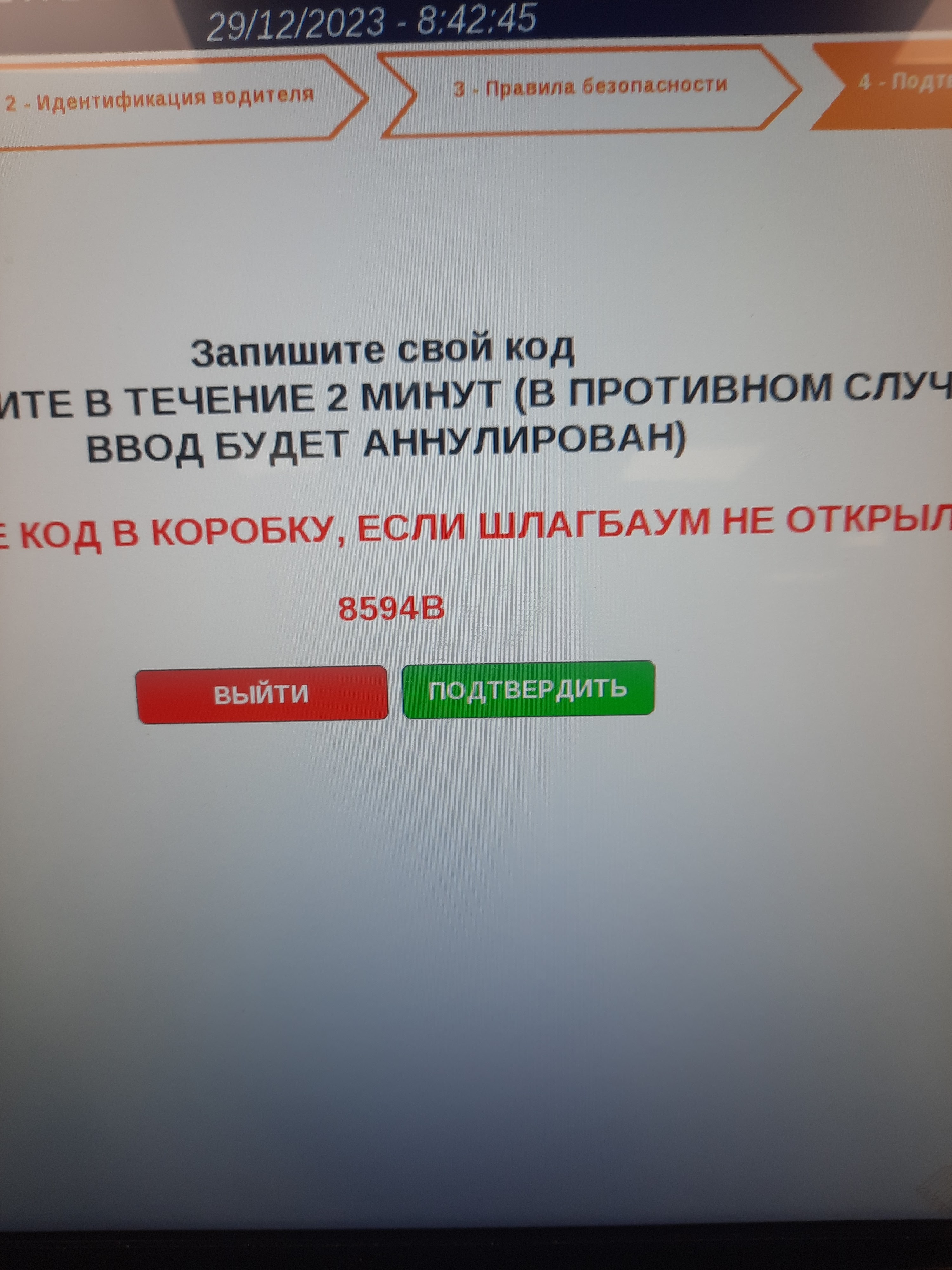 Alors allons-y. Vous n'êtes pas obligé de venir plus tôt. Je suis arrivé un jour avant et au final je n’ai même pas pu passer l’inscription. Ils peuvent vous décharger une heure avant l'heure convenue. Nous arrivons, nous garons sur le parking (vous pouvez faire une pause à tout moment), récupérons les documents et nous dirigeons vers la sécurité. Le terminal est sécurisé, il y a la langue russe, nous entrons toutes les informations nécessaires, numéro de téléphone. A la fin de l'inscription, il y aura un code pour ouvrir la barrière (si elle ne s'ouvre pas automatiquement), il vaut mieux l'écrire. Et voilà qu'un SMS arrive au téléphone avec le numéro de rampe, c'est parti. Le territoire est immense, on regarde attentivement les panneaux indiquant les rampes. Ensuite, tout est conforme aux normes, accostage au bureau, etc. La sortie par la barrière s'ouvrira automatiquement, vous n'aurez rien à montrer à personne. J'ai eu une interception. Tout est pareil avec, on monte jusqu'à la rampe indiquée dans le message SMS, on va au bureau, l'employé nous dit où mettre celui chargé et où récupérer celui vide, changer de remorque et partir. C'est simple.